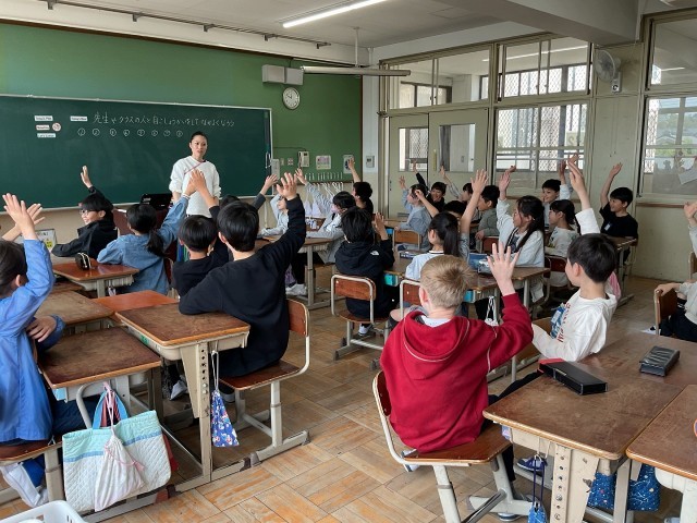 外国語活動の学習では、先生の自己紹介クイズにグループ対抗で挑戦しました。