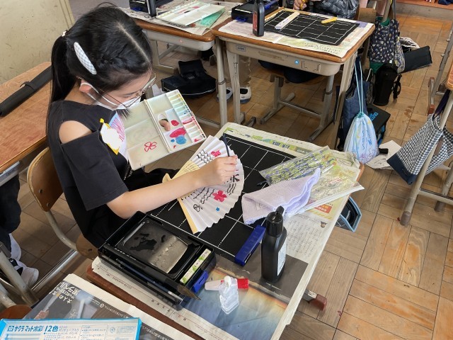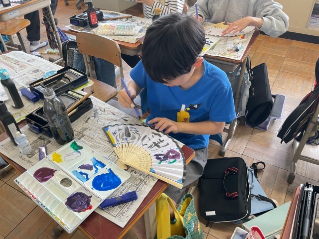 図画工作の学習で墨と絵の具を使って作品を作っています。今日は扇子に思い思いの絵や文字を書きました。教室後方に掲示していますので、参観日で学校に来られた際は、ぜひ見ていただければと思います。