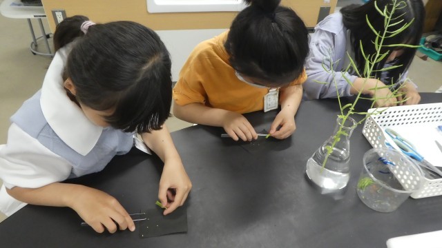 では、実際に調べてみようということになり、全員がアブラナの実と考えられるものの中身をはさみやピンセットで調べていました。