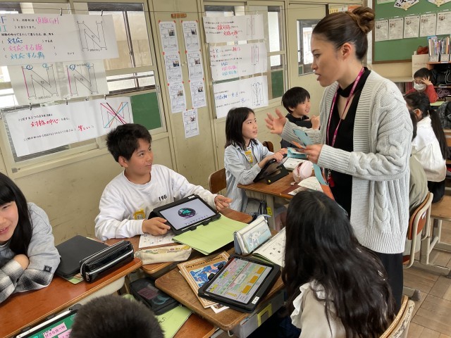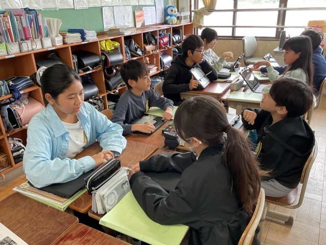 外国語の学習で自分の宝物を紹介する練習をしています。ゴールは5年生と自己紹介をし合います。今から交流が楽しみです。