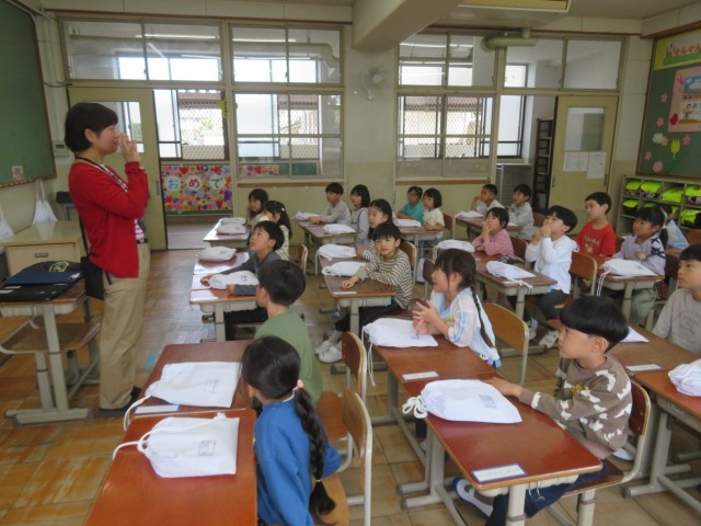 美味しく給食を食べるためにエプロンの着方や準備の仕方、お箸の持ち方などを学習しました。