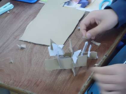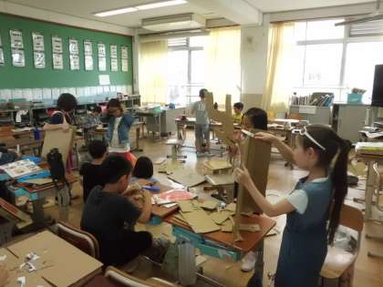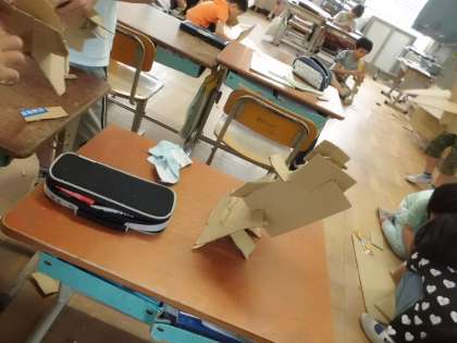 13日(火)の5・6時間目に段ボールを使って造形遊びをしました。子どもたちは段ボールを組み合わせて色々なものを作っていました。人型のものや動物,中には大きな羽のある生き物も作っている子もいました。また,生き物だけでなく同じ大きさの段ボールを高く組むことに挑戦している子もいて,それぞれが自分の思いをもって活動していました。完成した後は,「先生,となりのクラスの作品を見に行っていいですか。」と,自然とクラスをまたいで仲良く鑑賞をする姿も見られました。
