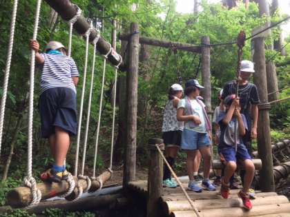 夜に雨が降りそうなので、テント泊は中止になりました。テント設営の活動がなくなったかわりに、冒険の森のアスレチックを楽しみました!最初は怖がっていた子達も時間が経つにつれて、楽しんでいました!