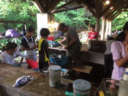 野外炊事場の片付けが始まりました。ご飯を食べてホッとひと息のところでも、みんながテキパキと動いて素早く片付けができています!