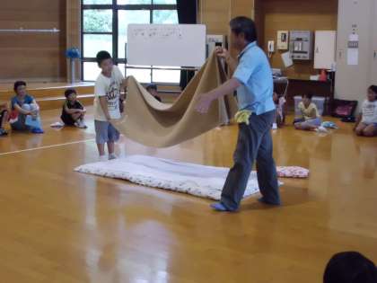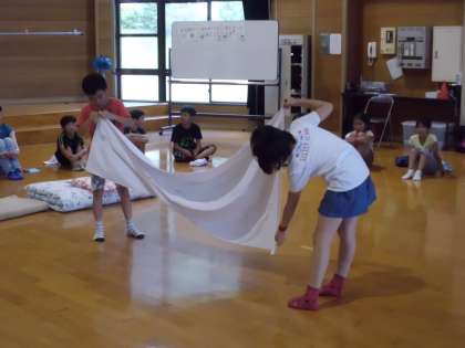 入所式のあと,みさきの家での過ごし方について,所員の方のお話を聞きました。これで,シーツや毛布もきれいにたためます!