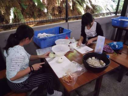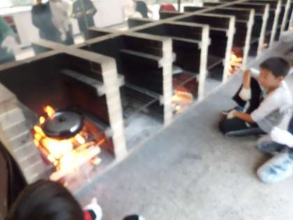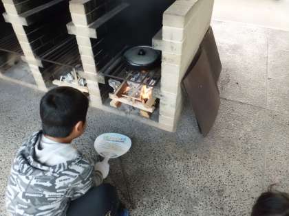 切った材料を鍋に入れて,かまどにしっかり火がついたところで,ぐつぐつと煮ます。おいしそうな匂いも漂い,もうすぐ完成です!あと少しがんばれ〜!