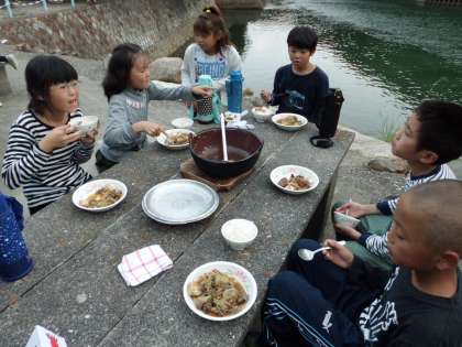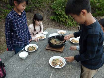 みんなの手際の早さで,電車が遅れた分も感じさせない時刻に完成しました。みんなで一生懸命作った夕食を,大自然の中で食べるなんて,最高の気分です!