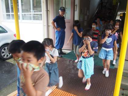 9/12(火)の2時間目に,避難訓練を行いました。今回は,火災を想定して行いました。子ども達は,静かに,テキパキと,落ち着いた様子で避難することができました。避難の様子を見ていただいた,岩倉北消防分団の方からも,上手に避難することができていたとほめていただきました。