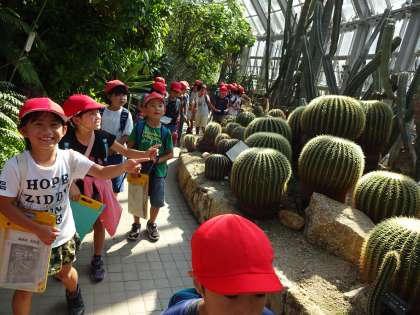 普段は見ることのできない大きな葉っぱやふしぎな形の花,サボテンが見つかりました。