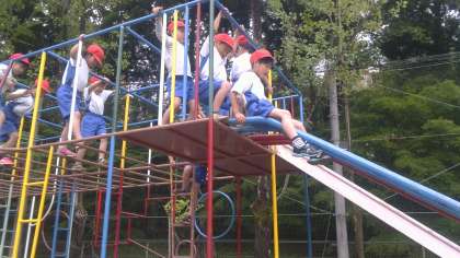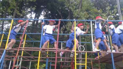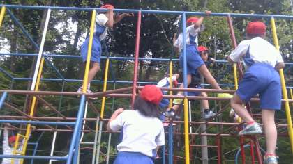 この学習で,総合遊具の一番高いところまで登る練習をします。うまく登りおりができるようになったら,そのあとは,休み時間も遊んでいいことになっています!
