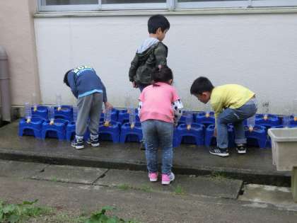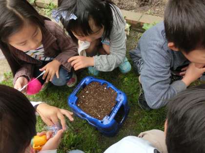 初めて育てるあさがおにドキドキ・・・。小さな種をじっくり観察をして大切に大切に手にとって「おおきくなあれ」と心を込めて植えました。植えると次の日から子どもたちははりきって水やりをして「おおきくなるかな?」「いつめがでるかな?」とわくわくして芽が出るのが待ち遠しい様子でした。大切に育ててほしいと思います。