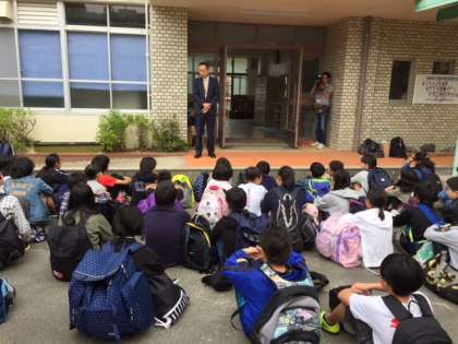 小学校生活、最初で最後の修学旅行がスタートしました!朝早くにもかかわらず、全員元気に集合して、出発式が始まりました。