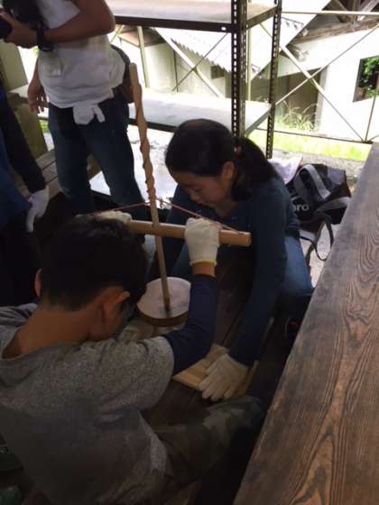 木と木をこすり合わせ、火を起こします。湿度が高く、なかなか難しいです。