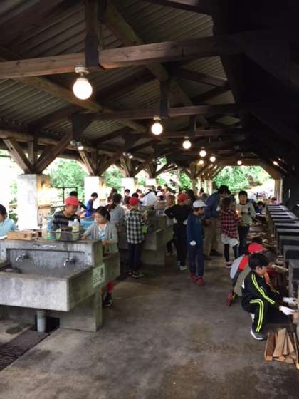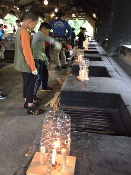 自分たちで起こした火を使って、すき焼き風煮を作ります。