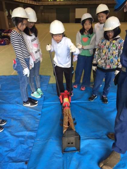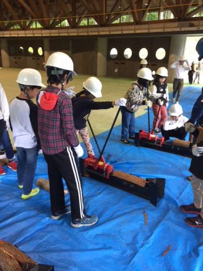 木を適当な大きさに切ったら、薪割りの機械を使って、木を割いて、薪にします!