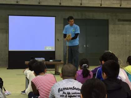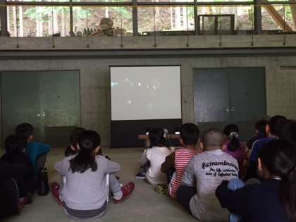 地松作りの体験が始まりました。まずは、花背の松上げについてお話を聞いたり、地松の作り方を教えてもらっています。