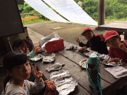 最後にアルミホイルを開いて、ケチャップをかけて、美味しくいただきます!少し焦げた子もいましたが、自分たちで朝食を作って食べることができました!