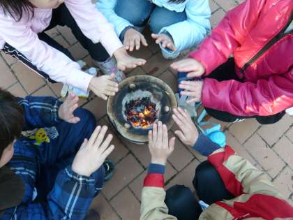 その後、野外炊事場に移動し、森田先生に教わりながら七輪体験学習をしました。目を痛がったり、なかなか炭に火がつかずに苦戦したりしている子もいましたが、みんなで協力してお餅を焼きました。お餅を焼いた後は、七輪をみんなで囲んで暖を取りました。ほほえましい光景でした。