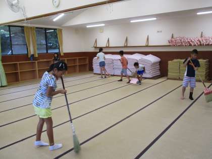 そうじの時間です。毎回の活動の中で,しっかりと後片付けはしていますが,朝のこの時間,みんなでそうじをすることで,“来たときよりも美しく!”を目指します。みんなで協力して,“来たときよりも美しく!”を達成してほしいものです。