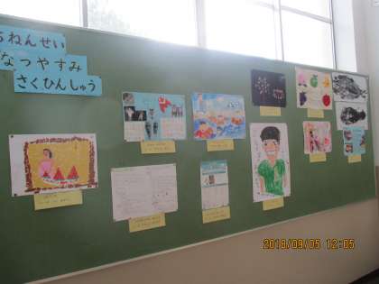 本日(9月5日)の参観・懇談は延期となりましたが,夏休み作品鑑賞週間は通常通り行っております。ぜひ,お越しください。写真は3・2・1年生の展示の一部です。