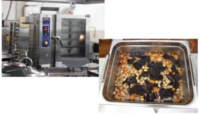 「五目煮豆」は,スチコンで作りました。大豆を釜で下茹でして,さいの目切りにしたにんじんやちくわ,こんにゃくと昆布とともに,しょうゆや三温糖で作った調味液に浸けて,蒸し煮にしました。