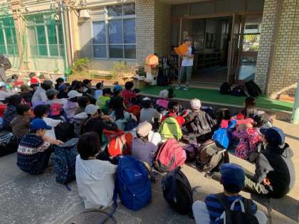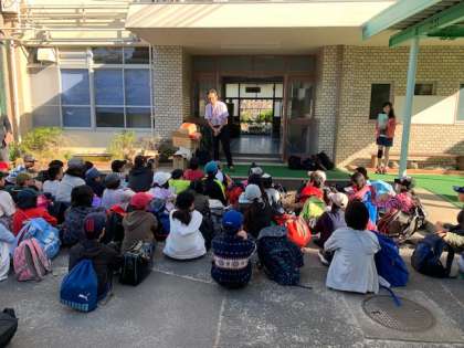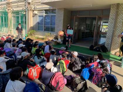 最高の天気、6年生全員の笑顔がそろって元気よく出発です!好きなことをする、人のためにするを考えながら、悔いを残さない一泊二日にしてきます!