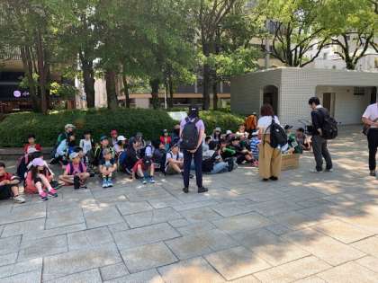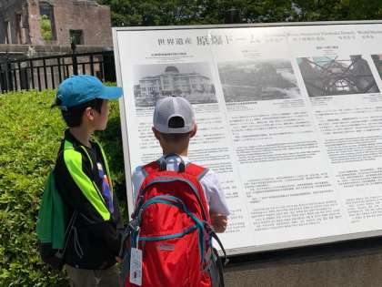 原爆ドームを見ています。人類史上初めて使用された核兵器の惨禍を伝える歴史の証人、核兵器の廃絶と世界の恒久平和の大切さを訴える人類共通の平和祈念碑として世界遺産に登録されたとの説明があります。子供達にも伝わっていることと思います。
