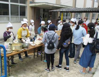 総合防災訓練の最後は,炊き出しをいただきました。アルファ化米,おにぎり,豚汁をつくっていただき,おいしくいただきました。炊き出しにも,たくさんの方のご協力がありました。本当にありがとうございました。