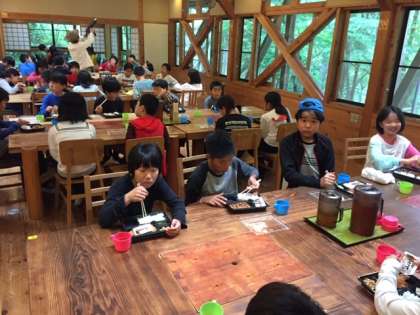 間伐体験の後は翠峰荘で昼食です。とんかつ弁当をおいしくいただいています。