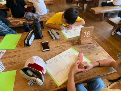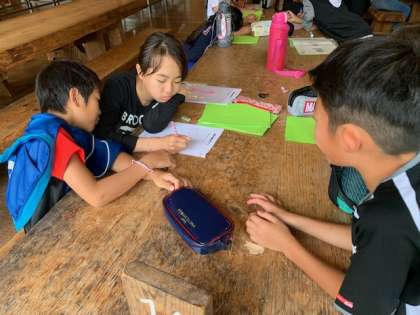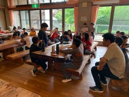 昼食後、そのまま、食堂に残って、ふりかえりをしています。毎日のふりかえりごとに書きためてきたカードをもとに、今日のふりかえり、長期宿泊のふりかえり、そして、これからのことについての意見がたくさん出ていました。