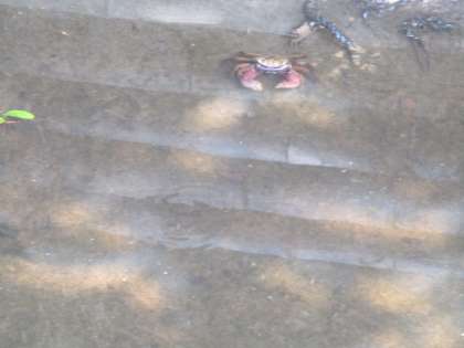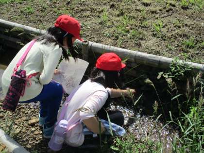 ラリーをしていると,たくさんの生き物に出会います。メダカやアメンボ,大きな沢蟹,カエルの天国という場所もありました。子どもたちも,生き物に興味津々です。