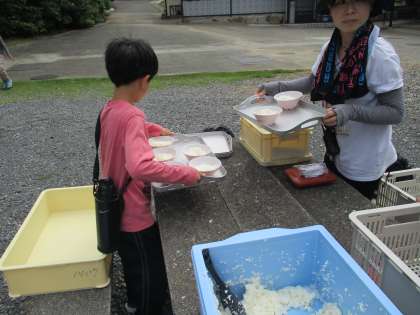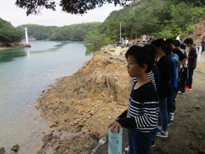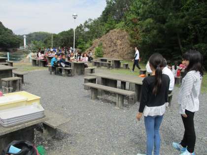 少し時間は早いですが,最高にコンディションの良い12時からの磯観察に合わせて,昼食の準備です。昼食から食事場所は野外炊事場になりました。目の前に深谷水道という海の道があり,とても眺めがよい場所です。