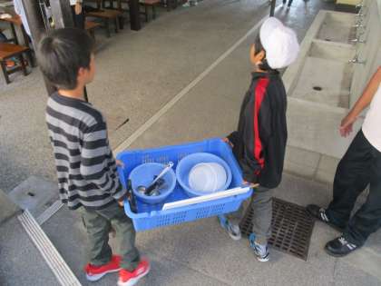 調理する道具も,料理を食べるための食器も,自分たちで運びます。
