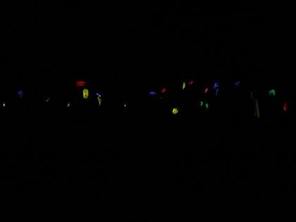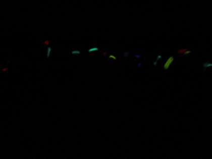ナイトウォークに出発です。みさきの家の夜はとても暗いです。持って行ったデジカメで写真を撮ると下の写真のような様子です。手首につけた光るブレスレットがきれいに光っています。