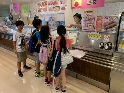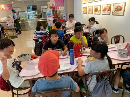 見学の合間に、レストランで昼食です。先生から昼食のチケットをもらって、食べたいメニューを伝えて、班の友達と楽しく食べました。班ごとに、スケジュールを立てて動いているので、決まった時刻等はありませんでしたが、全ての班がしっかりとお昼ご飯を食べることができました!