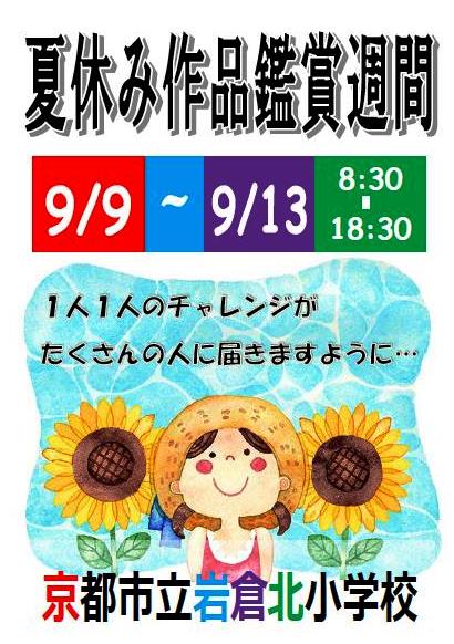 お知らせさせていただいていた通り,今年度も夏休み作品鑑賞週間を開催いたします。期間は,9月9日(月)〜9月13日(金)の1週間で,時間は8:30〜18:30です。9月11日(水)の参観・懇談会の際にご覧になることもできます。