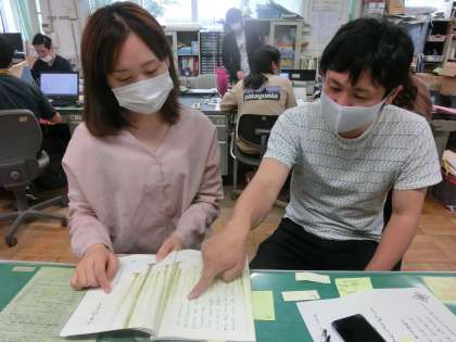 河村先生と岡本先生が「ふきのとう」の 音読をしています。春をかんんじる「ふきのとう」皆は見たことがありますか?