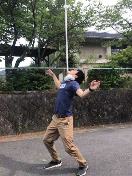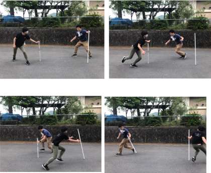 2枚目は2人組で2m以上離れて棒を立てて,せーのではなして,相手の棒が倒れないうちに走って棒をキャッチします。少しずつ離れていくとレベルアップ!
