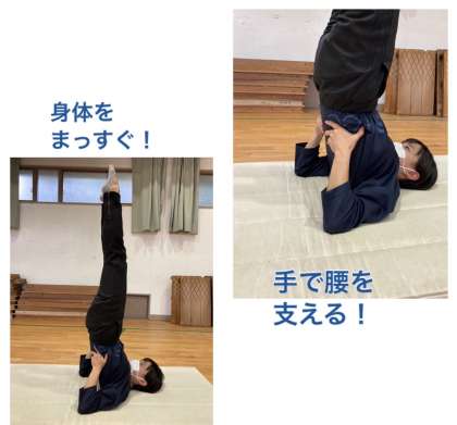 1つ目は『肩倒立』です。ポイントは肩とひじで体を支えて,手でしっかり腰をもって体をまっすぐにキープしましょう。10秒キープできれば,すごいです!イメージは京都タワーです。スカイツリーでもいいですよ。