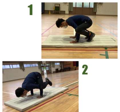 2つ目は『カエル倒立』です。両ひじを両ひざの内側にあてて,しっかり固定します。まずは1秒足を離してみましょう。そこから少しずつ時間を伸ばしていきましょう。見た目は地味ですが,10秒キープできればムキムキへの第一歩です。