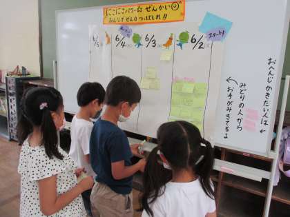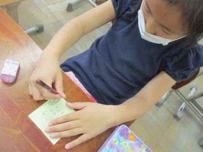 今日は,朝来てすぐに目についたのがホワイトボードに書いてあるメッセージ。昨日の緑グループが残したメッセージです。「お手紙みたい!」「お返事かきたい!」と言って早速お返事を書きました。みんなのメッセージも明日届くのが楽しみです。