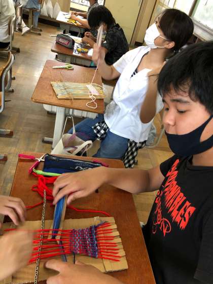 7月1日は,先週作った織機を使って,実際にコースターを作りました。