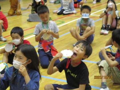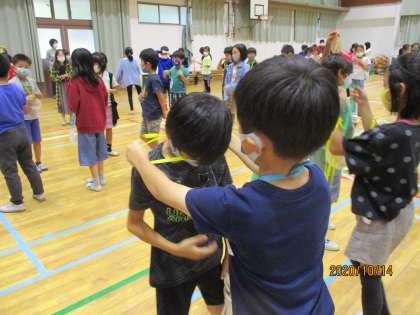 ともに頑張った3年生にオリンピックメダルを作りました。今日は,それをそれぞれが自分で3年生の首にかけてあげます。また,同じく3年生も4年生にメダルをかけてくれました。表には,イワキタオリンピックキャラクターの絵が,裏には,一人一人にちがったすてきなコメントが書かれています。