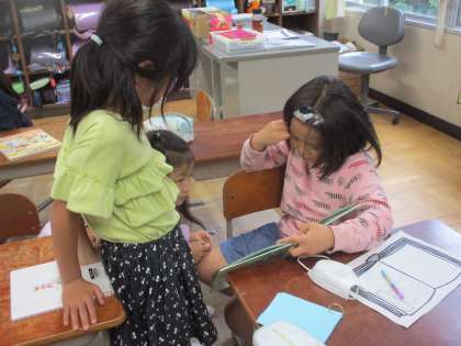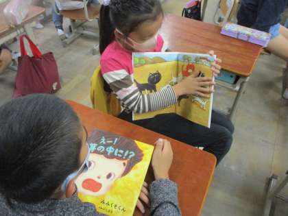国語科の「ミリーのすてきなぼうし」では,お気に入りの本の紹介をするという目的に向けて学習を進めています。いろいろなページの誰が何をしたかをページをめくりながらペアのお友達に伝える楽しそうな様子が見られました。