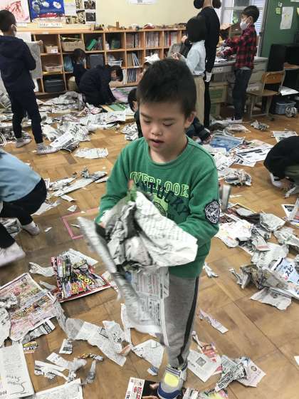 交流学年のお友だちと一緒に図工「しんぶんしとなかよし」の活動をしました。