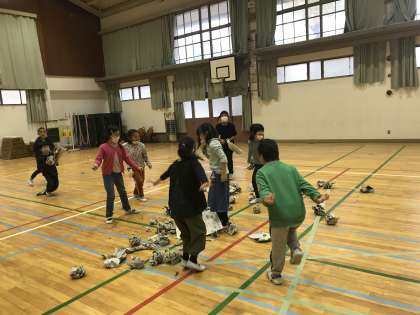 新聞紙をちぎったり丸めたり投げたりしてなかよく楽しむことができました。