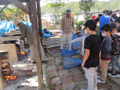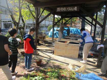 さあ,準備が整ったら窯にお芋を入れていきます。火を起こしてもらい,かまどの準備もしてもらいました。かまどの近くはとても熱いです。どんなお芋が出来上がるのかわくわくが止まりません。1時間程度待ってお芋が出来上がりました。