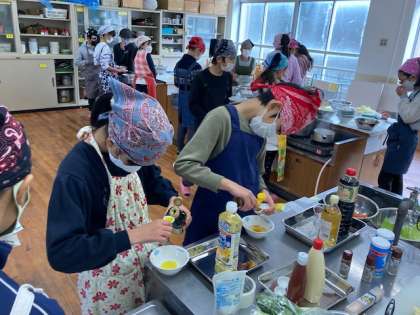 家庭科『おいしい楽しい調理の力』で,ゆで野菜サラダとゆで卵の調理実習を行いました。今回は食材のゆでる順番やゆで時間を変えることで食べた時の食感が変わることについて学習しました。ゆで野菜ではニンジン→ブロッコリーキャベツの順番で同じなべで時間を計りながらゆでました。ゆで卵は3分・5分・10分・15分とゆで時間を変え,黄身や白身の硬さにどのような違いが出るかを調べました。実際に食べることでゆで時間と食感のちがいにつながりがあることを知りました。味付けも各班でフレンチドレッシングやオーロラソースなど様々なドレッシングにチャレンジして,おいしくいただくことができました。