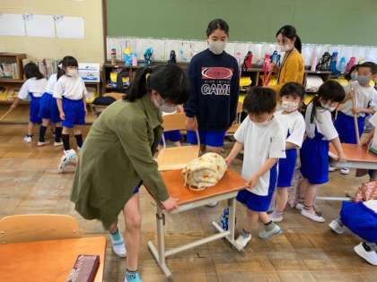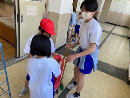 1年生の掃除が始まるということで,1年生が6年生に「掃除を教えてください!」とお願いに来てくれました。6年生も少し緊張しながら,1年生教室で各自役割に分かれながら声を掛け合い,掃除の仕方を教えています。「ほうきはこう持って…」とお手本を見せながら一緒にやりました。仲良く掃除をしたり,遊んだりしようね。
