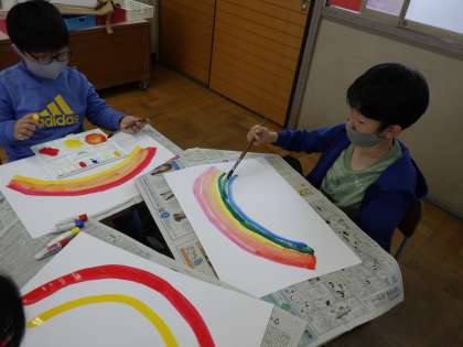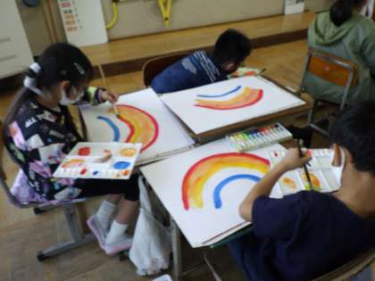 図画工作科の学習で,ぼく・わたしの虹を書きました。使う色は限って,今回は学習を進めましたが,色と色の重なりを楽しむことができました。この色の重なりを使って,これからどんどんいろんな絵を描くときに生かしてほしいと思います。